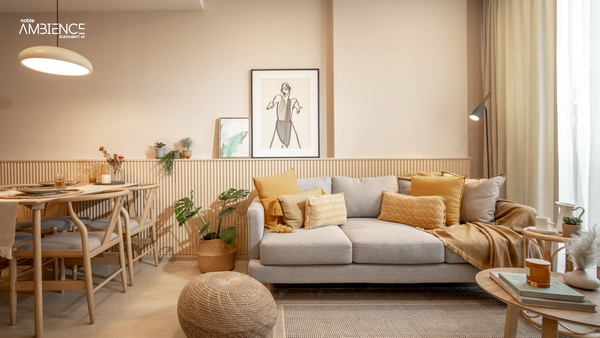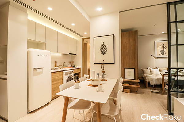 ชุดโต๊ะรับประทานอาหารจะตั้งอยู่ระหว่างโซนนั่งเล่นและครัวค่ะ