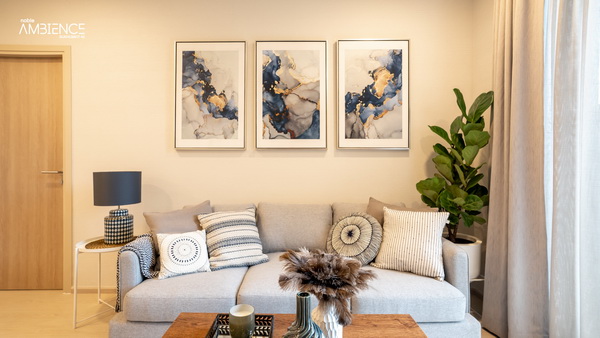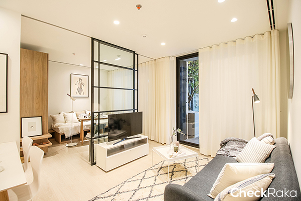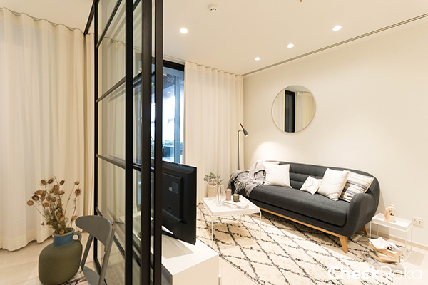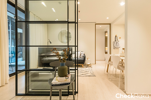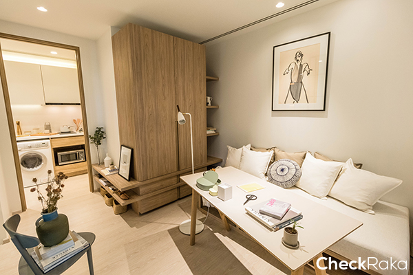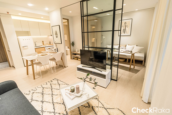 เข้ามาในห้องแล้วจะเจอพื้นที่นั่งเล่น/รับแขกก่อน ส่วนซ้ายมือจะเป็นครัวและห้องนอนห้องที่ 2