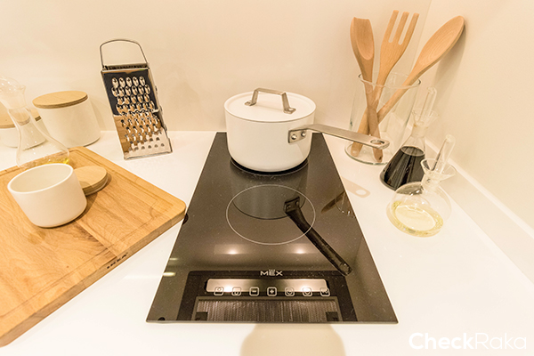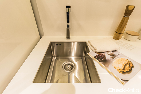 ลิ้นชักและฝาปิดตู้จะเป็น Soft Close ส่วน Top ที่เคาน์เตอร์เป็นหินสังเคราะห์สีขาวด้าน