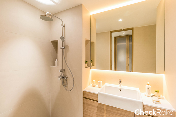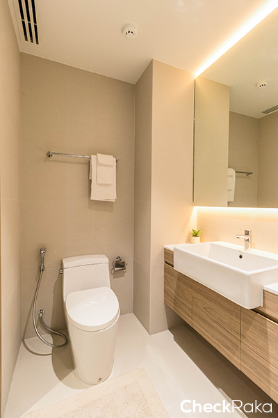 บรรยากาศในห้องน้ำ ห้องที่ได้จริงมีผนังกั้นอาบน้ำ Tempered Glass ด้วยค่ะ