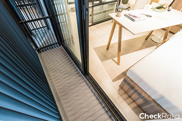 เปิดประตูบานสไลด์ออกไปก็จะเป็นระเบียง พื้นที่ระเบียงสามารถไปยืนเล่น รับลม หรือวางเก้าอี้ตัวเล็กๆ เอาไว้นั่งเล่นได้ค่ะ