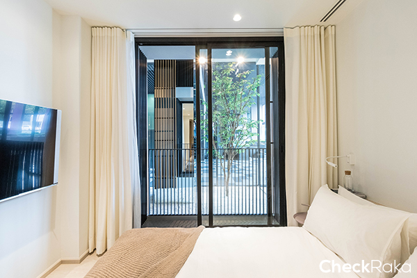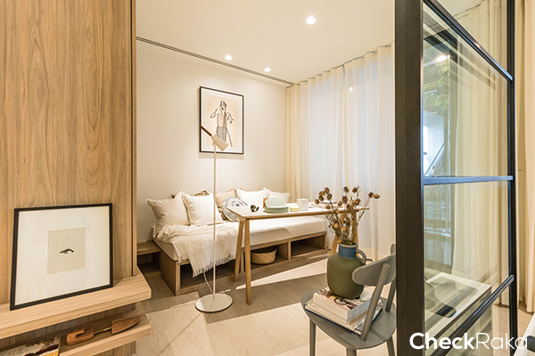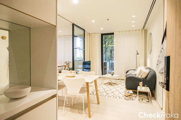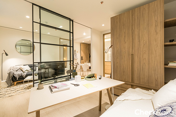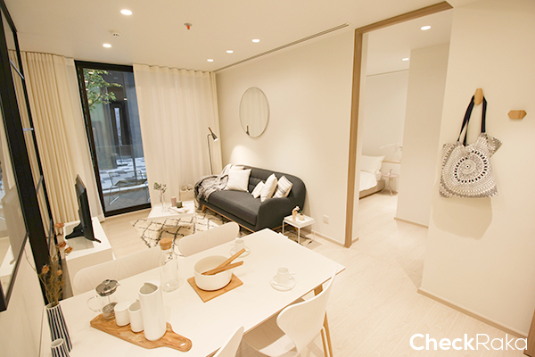 ห้องพักอาศัยของที่นี่ จะมีแบบ 1 ห้องนอน 225 ยูนิต ขนาดตั้งแต่ 25.20-41.50 ตร.ม. และแบบ 2 ห้องนอน 34 ยูนิต ขนาดตั้งแต่ 42.80-61.20 ตร.ม. รวม 259 ยูนิต โดยห้องที่ขายจะเป็นแบบ Fully Furnished โดยสิ่งที่ทางโครงการให้มาก็จะมี ตู้เสื้อผ้า Built-in (วัสดุเทียบเท่า), ชุดเคาน์เตอร์ครัว Built-in (วัสดุเทียบเท่า), เตาไฟฟ้า, เครื่องดูดควัน, อ่างล้างจาน, ชุดเฟอร์นิเจอร์ (โซฟา, เตียงขนาด 5.5 ฟุต สำหรับ Master Bedroom และขนาด 3.5 ฟุต สำหรับห้องนอนที่ 2, ชุดโต๊ะทานข้าว, โต๊ะกาแฟ (ตัวอย่างเทียบเท่า)), สุขภัณฑ์ภายในห้องน้ำ Digital Door Lock และเครื่องปรับอำกำศแบบชนิดแขวนผนัง Daikin (Split Type) 9,000-18,000 BTU สำหรับวันนี้ห้องที่เรารีวิวจะเป็นห้องแบบ 2 ห้องนอนค่ะ