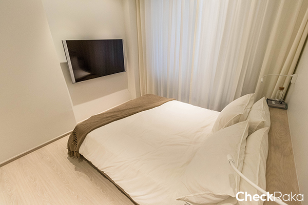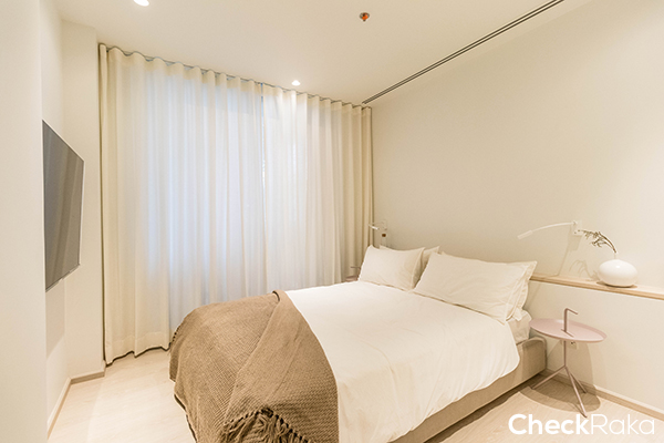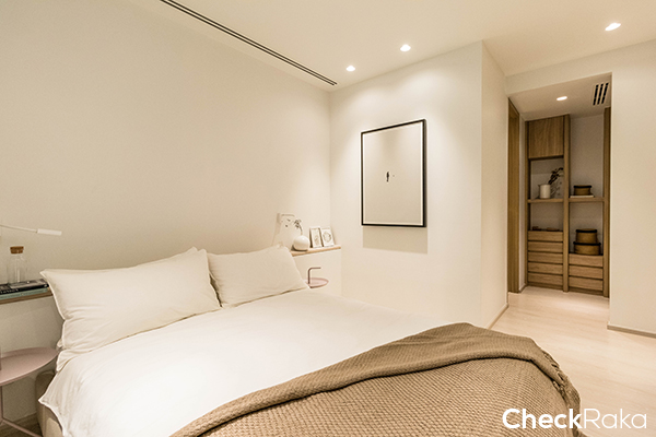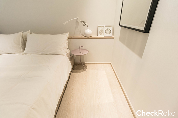 ห้องนอนค่อนข้างที่จะโล่ง โปร่งเพราะใช้สีขาวในการตกแต่งและความสูงจากพื้นไปถึงฝ้าอยู่ที่ 2.55 เมตร