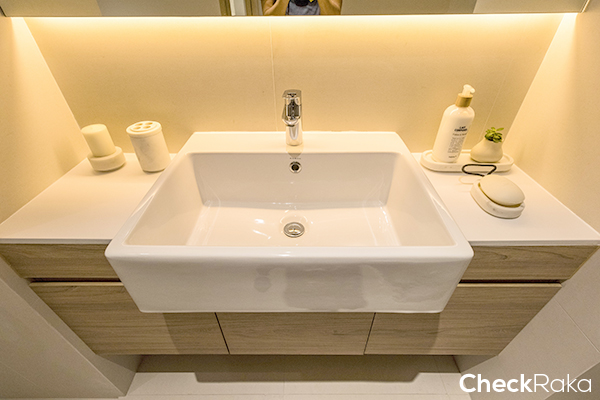 อ่างล้างหน้าขนาดใหญ่เดินท่อแยกน้ำร้อน-น้ำเย็น ส่วนก๊อกน้ำเป็นของ Grohe