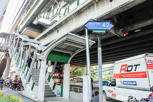 การเดินทางโดย BTS ถือว่าเป็นเส้นทางที่สะดวกและรวดเร็วมากๆ ค่ะ ให้ลง BTS ที่สถานีเอกมัย และออกทางออกที่ 2 จากนั้นเดินเท้าต่อเข้าไปในซอยสุขุมวิท 42 รวมๆ แล้วระยะทางประมาณ 350 เมตรเท่านั้น ถ้ามองลงมาจาก BTS เอกมัยก็จะเห็นซอยสุขุมวิท 42 เลย