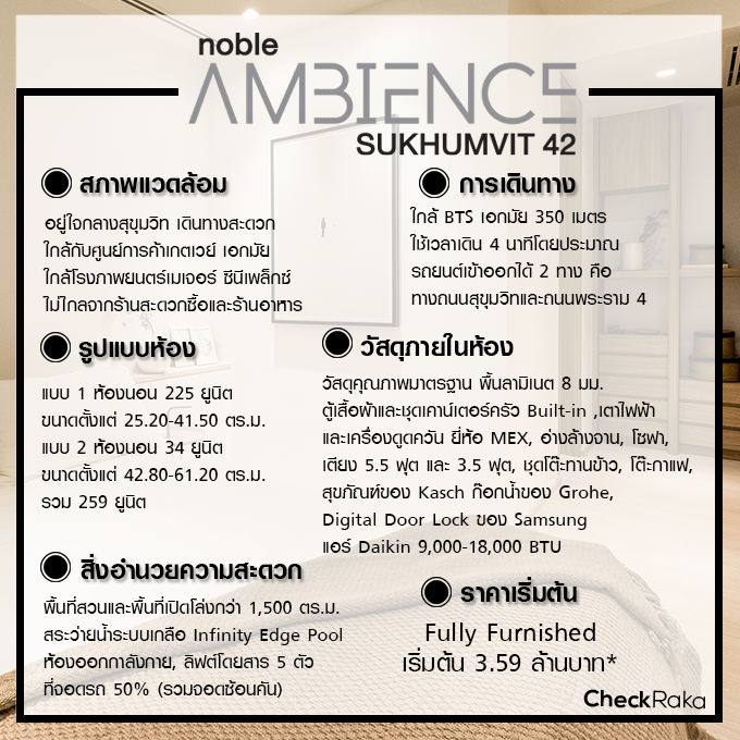 สวัสดีค่ะ วันนี้ CheckRaka.com จะพาไปเยี่ยมชมคอนโด "โนเบิล แอมเบียนส์ สุขุมวิท 42 (Noble Ambience Sukhumvit 42)" จาก โนเบิล ดีเวลลอปเมนท์ คอนโดมิเนียมใจกลางสุขุมวิท ที่ใช้แนวคิด "Lagom (ลากอม)" ในการออกแบบ เน้นความเรียบง่าย พอดี โดดเด่นแต่ไม่ทำลายเสน่ห์ของซอยสุขุมวิท 42 โครงการห่างจาก BTS เอกมัย 350 เมตร ใกล้กับศูนย์การค้าเกตเวย์ เอกมัย โรงภาพยนตร์เมเจอร์ซีนีเพล็กซ์ ชอปปิ้งคอมมูนิตี้มอลล์พาร์คเลนเอกมัย ฯลฯ เราไปชมบรรยากาศจริงของโครงการนี้กันเลยค่ะ