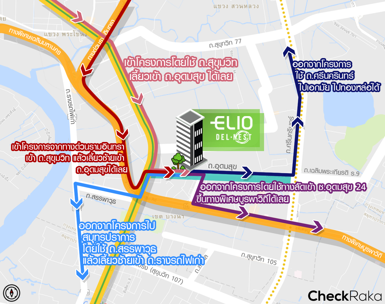 สำหรับคนที่ใช้รถยนต์ การเข้าออกโครงการนี้ถือว่าค่อนข้างสะดวก ถ้าเดินทางเข้าโครงการโดยใช้ถนนสุขุมวิท (เส้นทางสีชมพู) ก็มุ่งหน้ามาทางอุดมสุขตามแนวรถไฟฟ้ามาเรื่อยๆ พอเลย BTS อุดมสุข มาประมาณ 40 เมตร เลี้ยวซ้ายเข้าถนนอุดมสุข มุ่งหน้าต่อประมาณ 750 เมตรก็ถึงโครงการ หรือถ้าใช้ทางด่วน (เส้นทางสีแดง) เข้าถนนสุขุมวิทแล้วมุ่งหน้าต่อ 400 เมตรถึงทางแยกเลี้ยวขวาเข้าถนนอุดมสุข ตรงไป 750 เมตรก็ถึงโครงการ