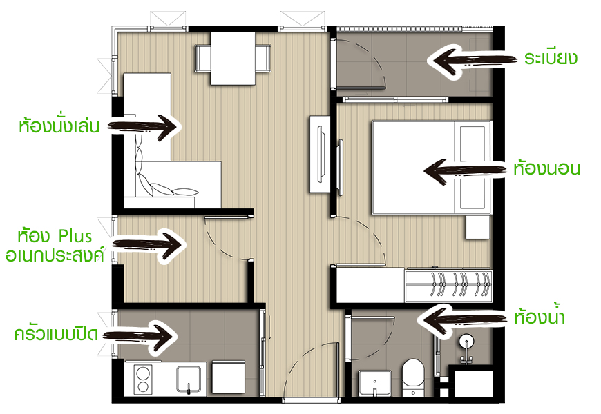 - 1 Bedroom Plus 32.00 - 34.5 ตร.ม.