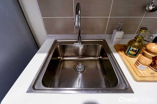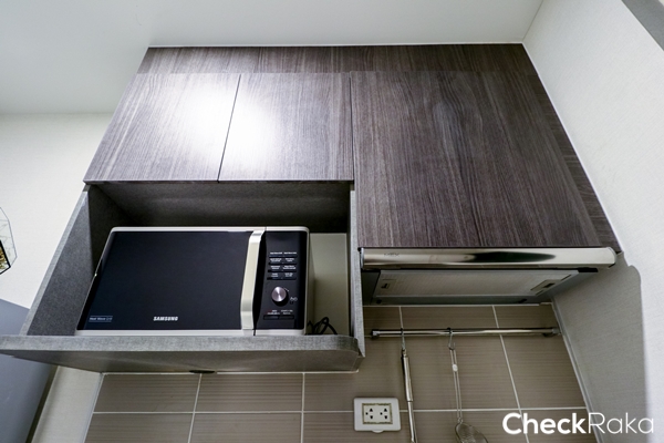 มีชั้นเก็บของมาให้ทั้งด้านบนและด้านล่าง รวมถึงปูกระเบื้องที่ผนังไว้ให้ สำหรับกันเปื้อนและสะดวกต่อการทำความสะอาด