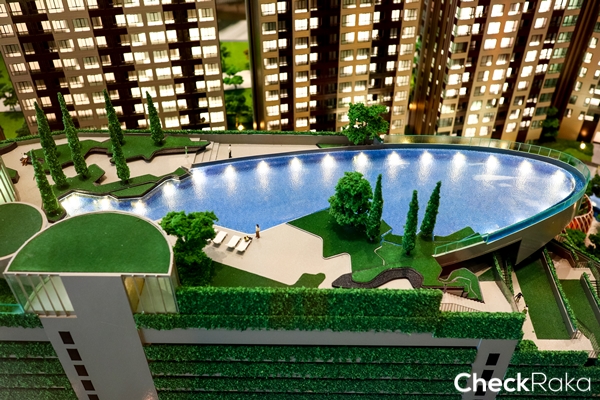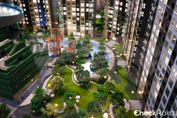 เป็นชั้นๆ ลดหลั่นลงไปยังชั้น Ground ที่มีสระว่ายน้ำและพื้นที่สีเขียวปกคลุมอยู่เต็มพื้นที่