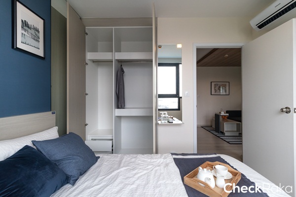 ห้องนี้จะได้ตู้เสื้อผ้า Built-in แบบบานเปิดขนาดพอๆ กับห้องที่แล้ว ด้านข้างได้โต๊ะเครื่องแป้ง Built-in ติดผนัง