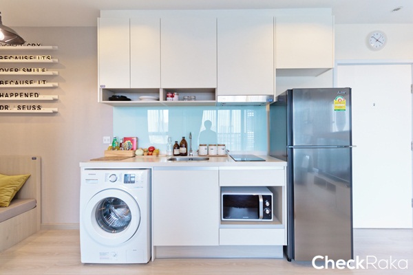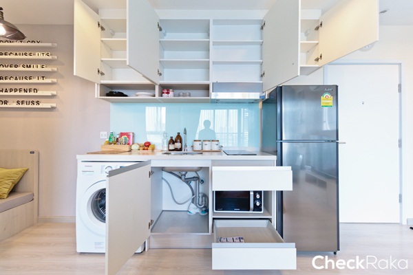 ห้องนี้ได้ครัว Built-in แบบเปิด ได้ชุดครัวของ Starmark พร้อมเครื่องดูควัน เตาไฟฟ้า อ่างล้างจาน ยกเว้นไมโครเวฟ