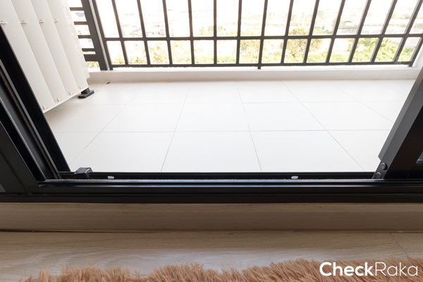 พื้นปูด้วยกระเบื้องเซรามิค 30 x 30 ซม. ที่ระเบียงเดินท่อน้ำดี น้ำทิ้งสำหรับติดตั้งเครื่องซักผ้าไว้ให้เรียบร้อย