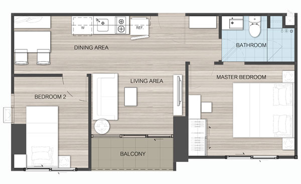 - ห้องแบบ 2 ห้องนอน 1 ห้องน้ำ Type D ขนาด 44.00 ตร.ม. เริ่มต้น 3.8 ล้าน