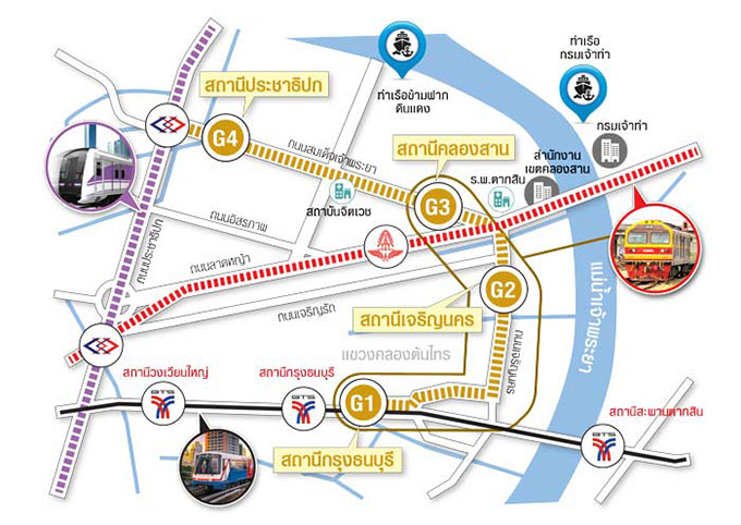 แผนผังการเชื่อมต่อของโมโนเรลสายสีทอง กับ BTS สายสีเขียว และ MRT สายสีม่วง มีจุด Interchange คือ BTS สถานีกรุงธนบุรี