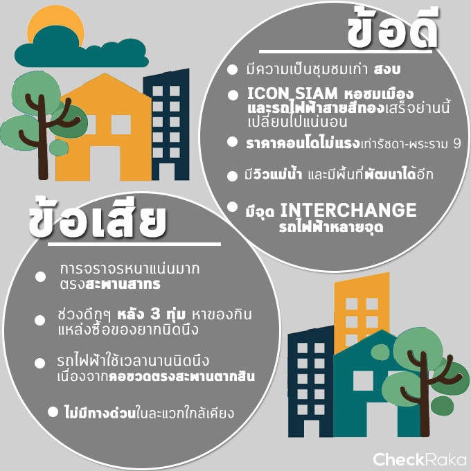 - ถือได้ว่าเป็นย่านที่ "คุ้มค่าที่สุด" ทำเลหนึ่งสำหรับคนทำงานในเมืองที่เดินทางโดย BTS เป็นหลัก เพราะแค่ข้ามแม่น้ำเจ้าพระยามาไม่ถึง 5 นาที ราคาคอนโด และที่ดินก็ลดลงกว่าเกือบครึ่ง เหมาะกับคนที่ไม่อยากสู้ราคาที่อยู่อาศัยแพงๆ ในเมือง และไม่ได้จำเป็น หรือต้องอยู่อาศัยในย่านใจกลางเมือง หรือทำเลเศรษฐกิจ