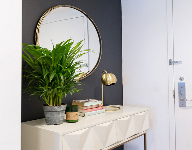 ตกแต่งทางเข้าเก๋ๆ ด้วยกระถางต้นไม้ กระจก และโคมไฟ