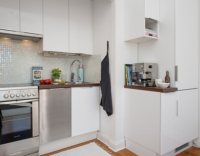 ที่ขาดไม่ได้คือห้องครัว ไม่ว่าพื้นที่จะจำกัดแค่ไหน ต้องไม่ลืมที่จะจัดสรรพื้นที่สำหรับห้องครัว อาจจะเล็กแต่ก็ยังสามารถใช้งานได้ คุณต้องรู้วิธีการใช้มุม การใช้เฟอร์นิเจอร์แบบตู้ Built-in จึงจะมีประโยชน์มาก