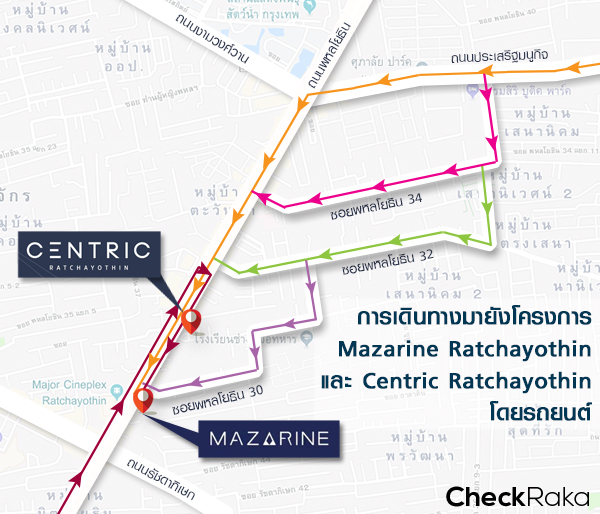 - จากถนนประเสริฐมนูญกิจ ให้เลี้ยวซ้ายเข้าสู่ถนนพหลโยธิน โครงการ Centric Ratchayothin จะอยู่ถัดจากซอยพหลโยธิน 32 (เสนานิคม) ส่วนโครงการ Mazarine Ratchayothin จะอยู่บริเวณปากซอยพหลโยธิน 30