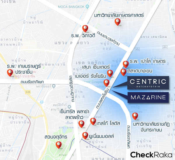 โครงการ Centric Ratchayothin (พิกัด 13°49'53.7"N 100°34'15.6"E) และโครงการ Mazarine Ratchayothin (พิกัด 13°49'44.5"N 100°34'10.1"E) ตัั้งอยู่ที่ถนนพหลโยธิน เขตจตุจักร กรุงเทพมหานคร 10900 โดยทั้ง 2 โครงการห่างกันประมาณ 300 เมตร