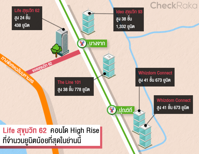 จากการสำรวจดูคอนโด High Rise รอบๆ BTS สถานีบางจาก มีอยู่ 2 โครงการคือ Ideo สุขุมวิท 93 และ ล่าสุดก็คือ Life Sukhumvit 62 โครงการ Ideo สุขุมวิท 93 สูง 38 ชั้น มีห้องพักอาศัย 1,332 ยูนิต และ ร้านค้า 2 ยูนิต ส่วน Life Sukhumvit 62 สูง 24 ชั้น ทำห้องพักอาศัยจำกัดเพียง 438 ยูนิต หรือถ้ามองไปยังสถานีใกล้เคียงอย่างสถานีปุณวิถี ก็มีคอนโด High Rise อยู่ 3 โครงการ คือ Whizdom Essence Sukhumvit สูง 50 ชั้น มีห้องพักอาศัย 664 ยูนิต ร้านค้า 2 ยูนิต, Whizdom Connect Sukhumvit สูง 41 ชั้น 673 ยูนิต ร้านค้า 4 ยูนิต และ The Line 101 สูง 38 ชั้น มีห้องพักอาศัย 778 ยูนิต ซึ่งส่วนใหญ่เปิดขายกันไปแล้ว