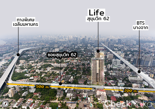 Life Sukhumvit 62 จึงตอบโจทย์ด้วยการเลือกที่ตั้งให้อยู่ใกล้กับ BTS บางจาก แค่ 200 เมตร ในระยะที่เดินได้ ไม่ไกลจนเกินไป และเลือกให้อีกฝั่งขับรถขึ้นทางด่วนง่ายๆ แค่ 500 เมตร คือถ้าที่ตั้งนี้เป็นผู้ชายก็คงเป็นผู้ชายที่ Cool มากกกก สะดวกไปอี๊กกก