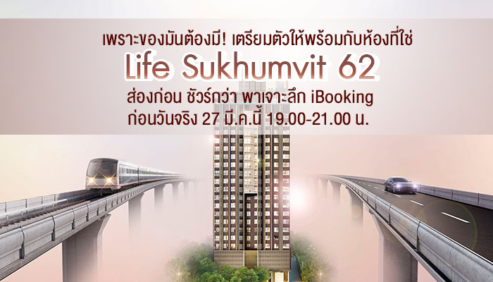 อย่าลืมเตรียมตัวให้พร้อมนะคะ โครงการ Life สุขุมวิท 62 จะเปิดจองแบบ AP i-Booking เท่านั้น บุ๊ควันไว้ให้ดี 27 มีนาคม นี้ เวลา 19.00 - 21.00 น. เลือกห้องที่ชอบ จด Number ห้องให้ดี เตรียมบัตรเครดิตพร้อมวงเงินปังๆ แล้วรอวันมาประลองความไวพร้อมๆ กันค่ะ