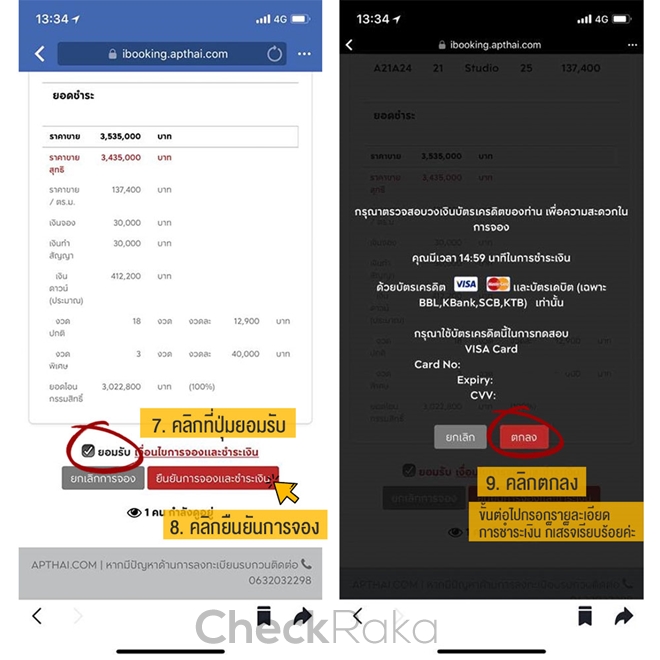 9. ในหน้านี้จะเป็นขั้นตอนของการกรอกรายละเอียดของบัตรเครดิต ต้องเตรียมวงเงินให้พร้อมสำหรับการจองในครั้งนี้ ห้อง Studio และ 1 Bed วงเงินจอง 30,000 บาท ห้อง 1 Bed+ วงเงินจอง 40,000 บาท และ ห้อง 2 Bed วงเงินจอง 50,000 บาท หลังจากนั้นจะให้คลิก "ตกลง" เมื่อขึ้นว่า "ชำระเงินเสร็จสมบูรณ์" แสดงว่าเราจองห้องสำเร็จแล้วค่ะ