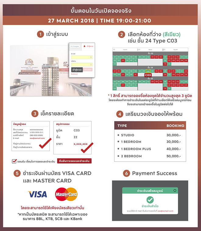 อย่าลืมเตรียมตัวให้พร้อมนะคะ โครงการ Life สุขุมวิท 62 จะเปิดจองแบบ AP i-Booking เท่านั้น บุ๊ควันไว้ให้ดี 27 มีนาคม นี้ เวลา 19.00 - 21.00 น. เลือกห้องที่ชอบ จด Number ห้องให้ดี เตรียมบัตรเครดิตพร้อมวงเงินปังๆ แล้วรอวันมาประลองความไวพร้อมๆ กันค่ะ