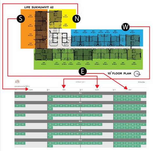 การดูแปลนอาคารและการดูตำแหน่งของห้อง ให้เลือกทิศทางของห้องก่อน ทิศไหนเป็นทิศไหนดูได้จากภาพด้านล่างนี้เลย เมื่อเลือกทิศเสร็จแล้ว ห้องที่อยู่ทิศนั้นๆ จะปรากฎขึ้นมา เราก็สามารถเลื่อนดูชั้นและกดเลือกเข้าไปดูห้องได้ตามต้องการเลยค่ะ