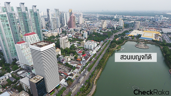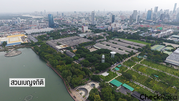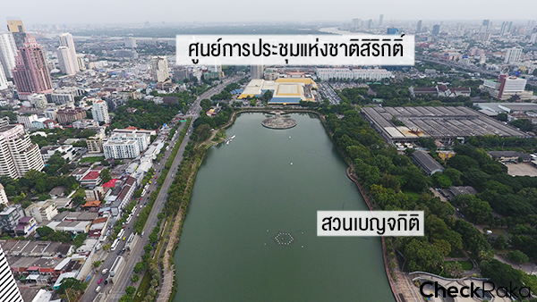 บรรยากาศมุมสูงสวนเบญจกิติและศูนย์การประชุมแห่งชาติสิริกิติ์