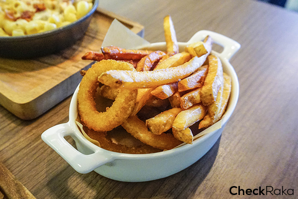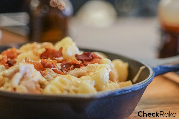 Mac and Cheese มักกะโรนีอบชีสและเบคอน โรยด้วยเบคอนกรอบๆ ด้านบน