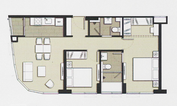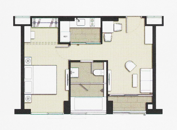 Layout ของห้องจะแบ่งออกเป็นสัดส่วนเลยค่ะ เดินตรงเข้าไปจะเป็นห้องนอน ส่วนซ้ายมือจะเป็นครัว ขวามือจะเป็นห้องน้ำ