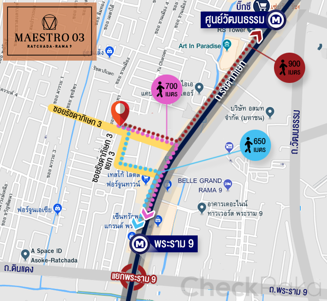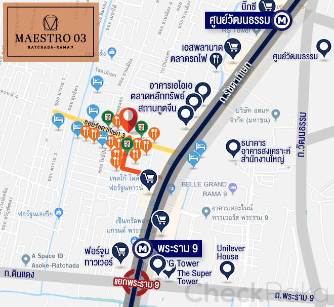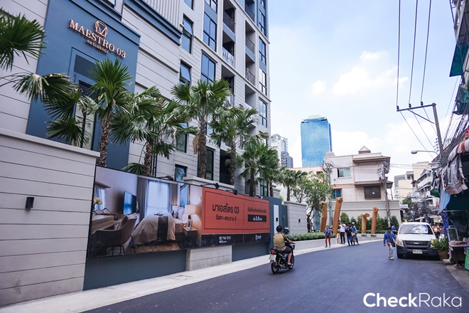 อย่างที่บอกไปตอนต้นว่า คอนโด มาเอสโตร 03 รัชดา - พระราม 9 (Maestro 03 Ratchada - Rama 9) ตั้งอยู่ในซอยรัชดา 3 (ซอยข้างสถานทูตจีน) แค่ 250 เมตร ในระยะการเดินถือว่าใกล้มาก สำหรับคนที่อยากอยู่คอนโดย่าน CBD โครงการนี้ถือเป็นตัวเลือกที่ดี เพราะมีความเป็นส่วนตัวสูงมาก ทั้งเรื่องของทำเลและเรื่องการอยู่อาศัยในโครงการ เพราะเป็นอาคาร Low Rise ที่มียูนิตค่อนข้างน้อย ที่สำคัญร้านค้าอาหารการกินเยอะมากๆ กระจายตัวอยู่แทบทั้งซอย ซึ่งมีทางเดินลัดไปฟอร์จูน และ Tesco Lotus และเดินข้ามไปเซ็นทรัลพระราม 9 ได้โดยใช้ทางเชื่อมของ MRT วันนี้จะพาไปเดินดูบรรยากาศจริง ไปกันเลยค่ะ