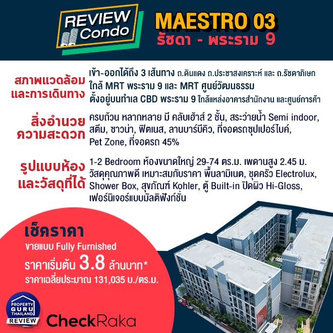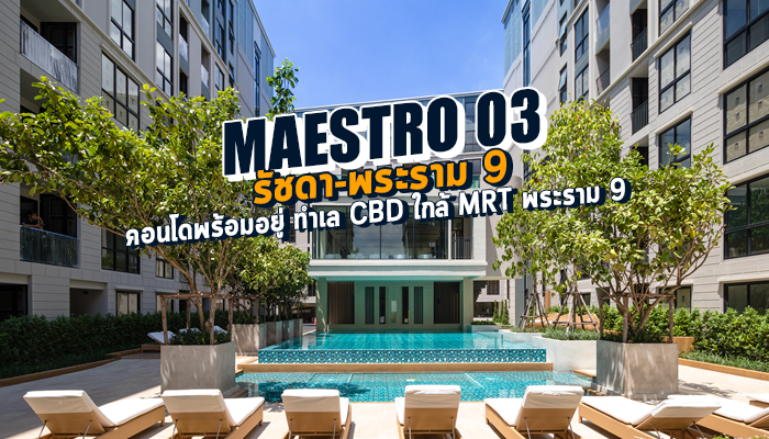 อีกหนึ่งโครงการคอนโดมิเนียมพร้อมอยู่ที่น่าสนใจภายใต้แบรนด์ "มาเอสโตร" ที่จะพาไปชมกันคือ มาเอสโตร 03 รัชดา - พระราม 9 (Maestro 03 Ratchada - Rama 9) คอนโด Low-rise ทำเลใจกลางเมืองใกล้ MRT 2 สถานี ทั้งจากสถานีพระราม 9 และ MRT ศูนย์วัฒนธรรม ตกแต่งด้วยสถาปัยกรรมสไตล์ยูโรเปียน คลาสสิก เป็นโครงการแรกภายใต้แบรนด์ "มาเอสโตร" ที่มีเนื้อที่ขนาดใหญ่กว่า 3 ไร่ มาพร้อมคลับเฮ้าส์สูง 2 ชั้น และสระว่ายน้ำแบบ Semi Indoor แยกส่วนกลางออกจากอาคารพักอาศัย และเป็น Pet friendly เลี้ยงสัตว์ได้ทุกยูนิต ราคาก็ไม่แรงมาก ตามเราไปชมบรรยากาศจริงของโครงการนี้กันค่ะ