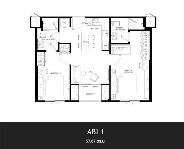 2) ภาพห้องตัวอย่างแบบ 2 ห้องนอน ขนาด 57.67 ตร.ม.