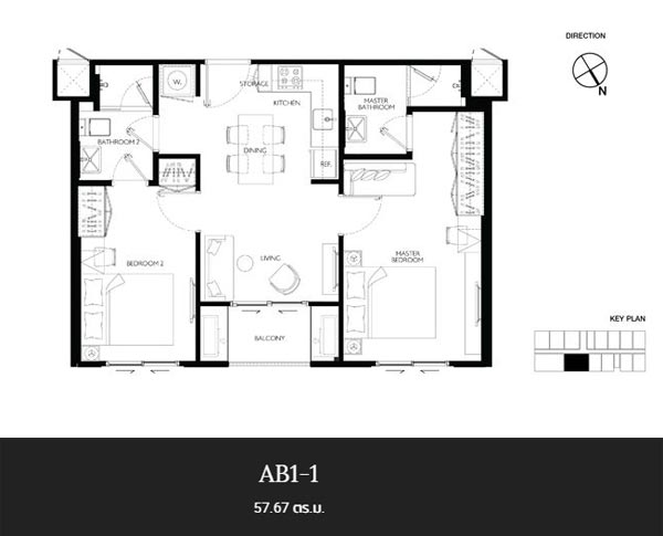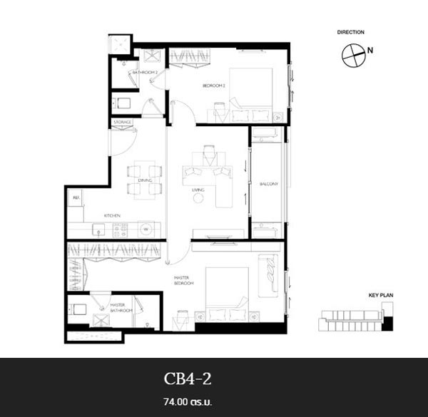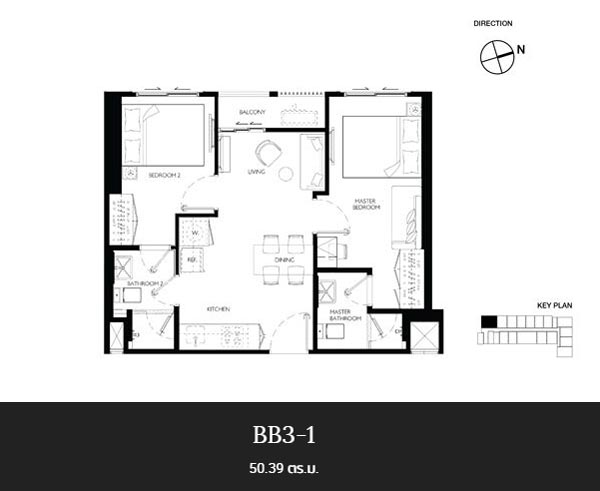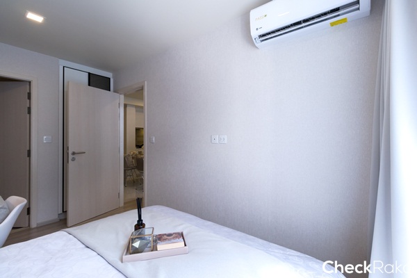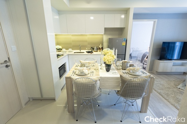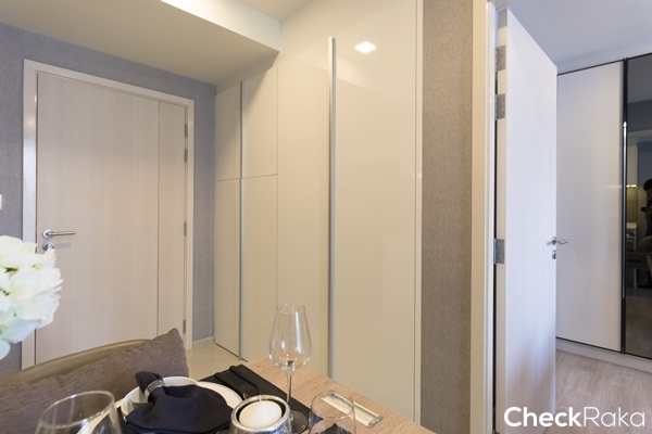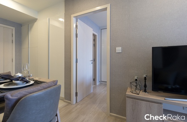 ห้องนี้จัดวางห้องครัวเชื่อมต่อกับห้องนั่งเล่นและระเบียง ฝั่งซ้ายเป็นห้องนอนใหญ่ และฝั่งขวาเป็นห้องนอนที่ 2