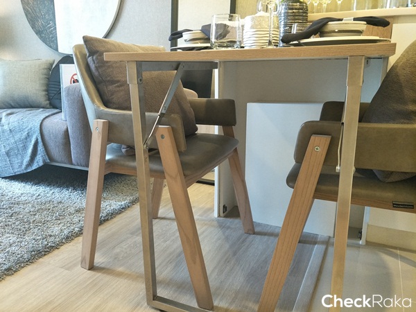 หากพับส่วนปลายโต๊ะขึ้นมาแล้วเลื่อนไปทางซ้ายจะเพิ่มพื้นที่บนโต๊ะทานอาหารได้อีกประมาณ 30 ซม.