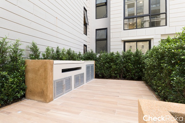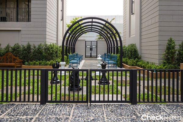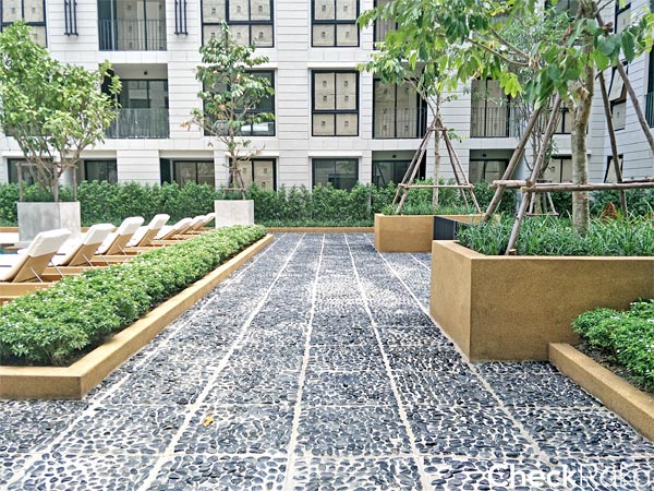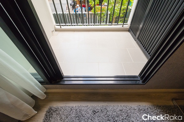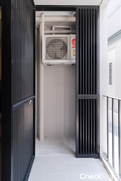 ระแนงบังสายตาสีดำดีไซน์ให้ซี่กริลเป็นรูปตัว Z เพื่อระบายลมร้อนให้ออกไปยังด้านนอกระเบียงจะช่วยให้มุมนี้เย็นมากขึ้น