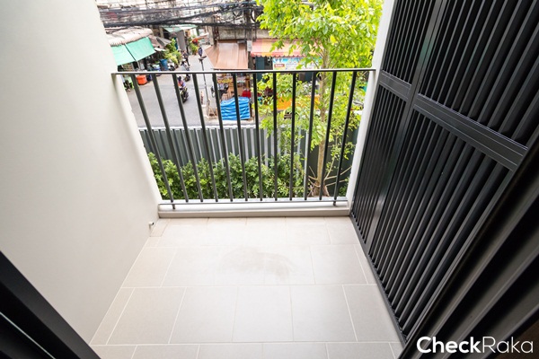 ราวระเบียงสูงประมาณ 110 ซม. พื้นที่ระเบียงปูด้วยกระเบื้องเซรามิก ต่อท่อน้ำดีน้ำทิ้งมาให้พร้อมใช้งาน