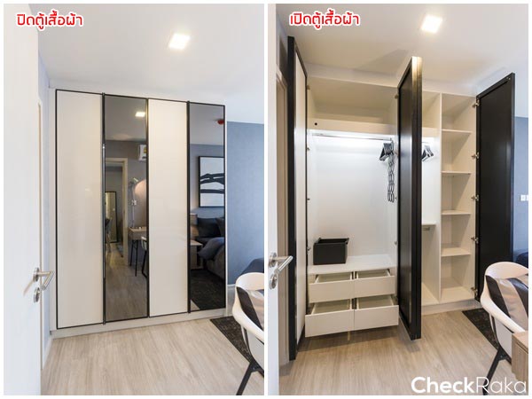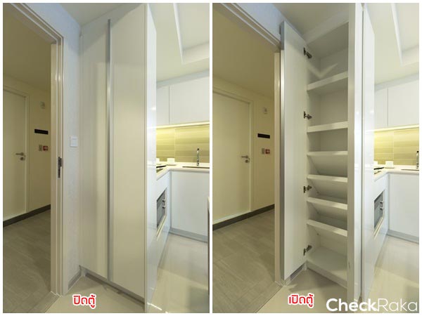 เข้ามาทางซ้ายเป็นตู้ Built-in สำหรับเก็บของ ขนาดเล็กกว่าห้องที่แล้ว กว้างประมาณ 60 ซม. สูงจรดฝ้า