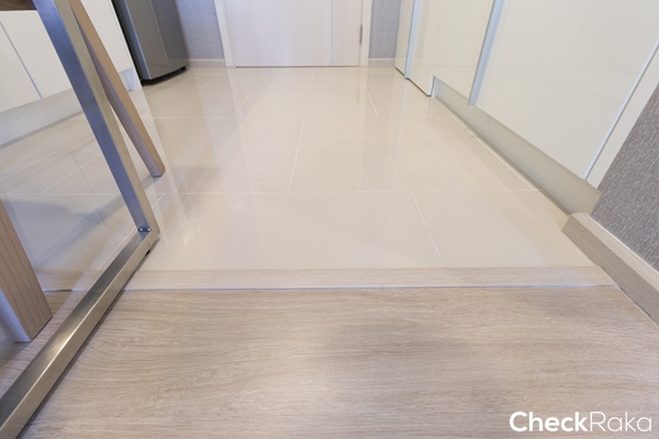 พื้นห้องครัวปูด้วยกระเบื้องแกรนิตโต้ ห้องนั่งเล่นปูด้วยลามิเนตหนา 8 มม.