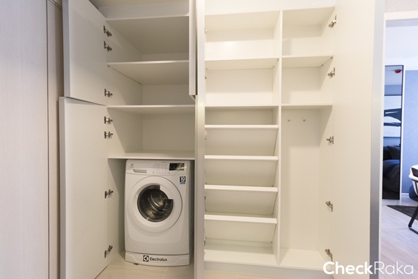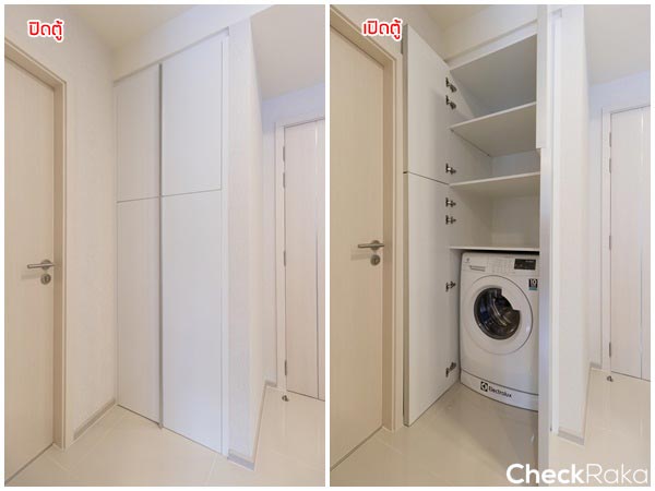 ใกล้กับห้องน้ำจะเป็นตู้สำหรับเก็บเครื่องซักผ้า ด้านบนเป็นชั้นวางของ