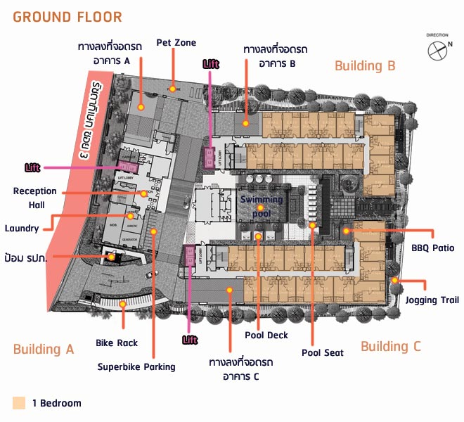 - อาคาร A : มีล็อบบี้, ห้องซักผ้า, ตู้จดหมาย, ที่จอดรถซูเปอร์ไบค์ และ ลิฟต์โดยสาร