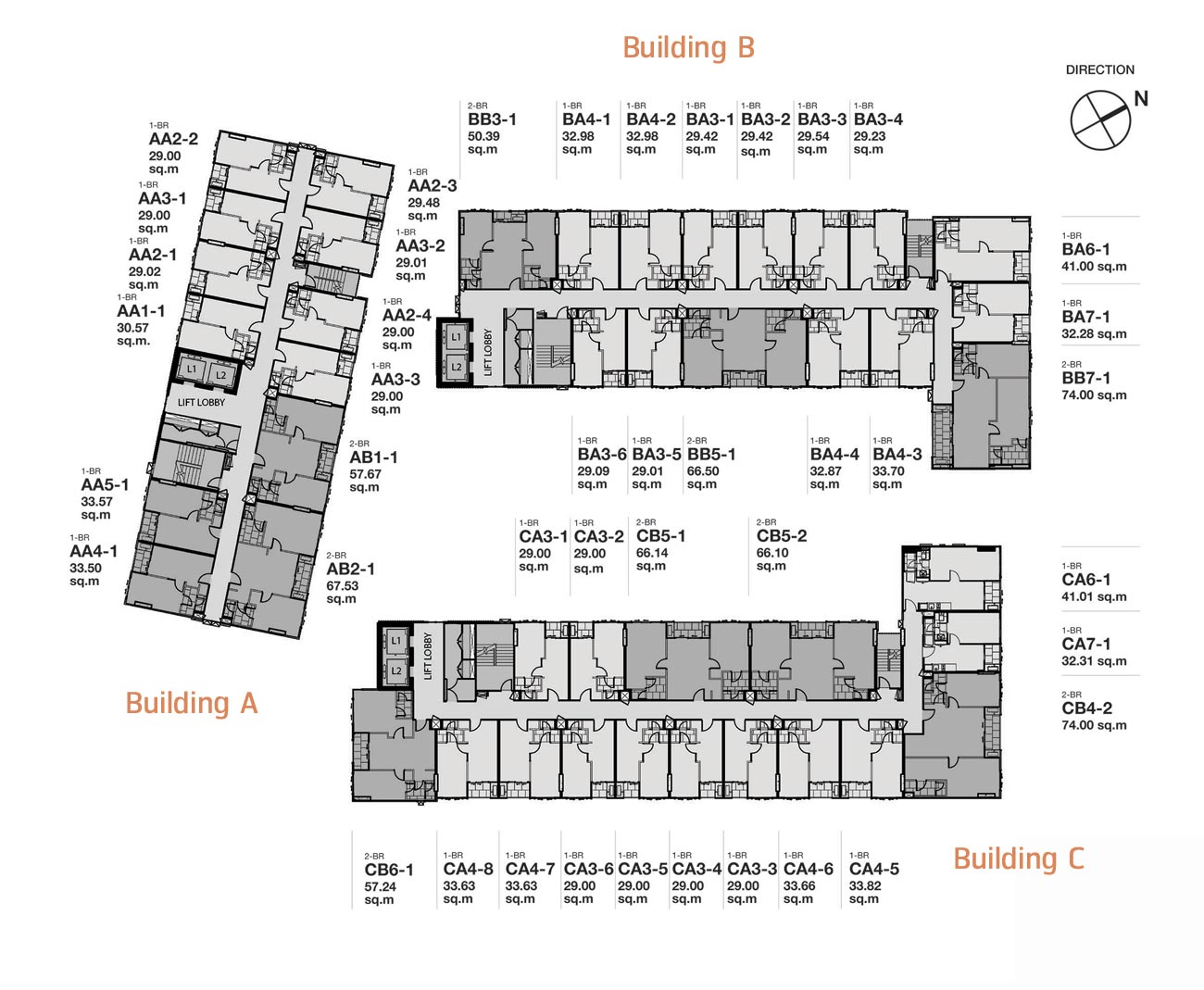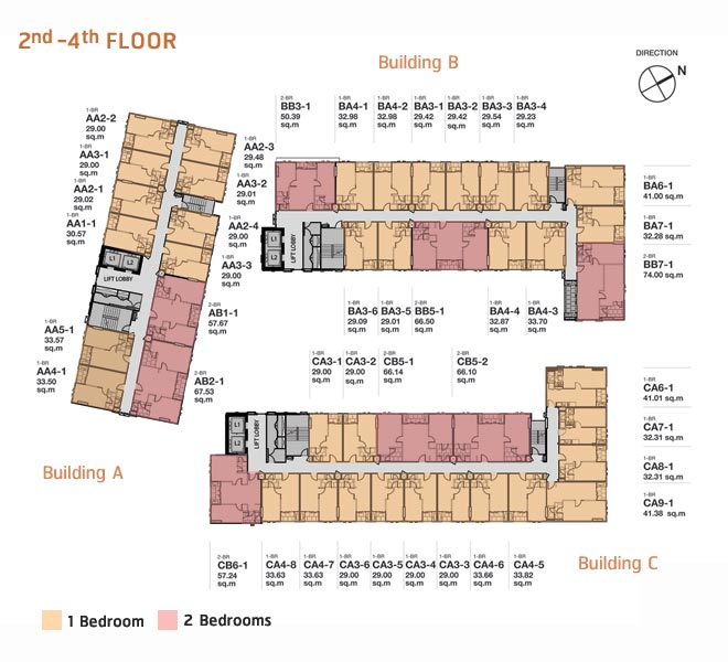 ห้องพักอาศัยของอาคาร A เริ่มต้นที่ชั้น 2 ส่วนอาคาร B และอาคาร C ห้องพักอาศัยจะเริ่มต้นที่ชั้น 1 โดยห้องพักอาศัยเฉลี่ยต่อชั้นของแต่ละอาคารจะใกล้เคียงกัน อาคาร A ประมาณ 12 ยูนิต/ชั้น, อาคาร B ประมาณ 15 ยูนิต/ชั้น และอาคาร C ประมาณ 16 ยูนิต/ชั้น