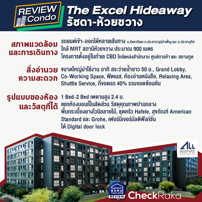 วันนี้เราจะพาไปเยี่ยมชมคอนโดมิเนียมใหม่ในย่าน NEW CBD โครงการนี้ชื่อว่า ดิ เอ็กเซล ไฮด์อะเวย์ รัชดา-ห้วยขวาง (The Excel Hideaway Ratchada-Huai Khwang) ใกล้รถไฟฟ้า MRT สถานีห้วยขวาง 900 เมตร จัดเต็มสิ่งอำนวยความสะดวก พร้อมสระว่ายน้ำความยาว 50 เมตร คอนโดแต่งครบ เฟอร์นิเจอร์แบบ Fully furnished จะน่าสนใจแค่ไหนตามไปชมกันค่ะ
