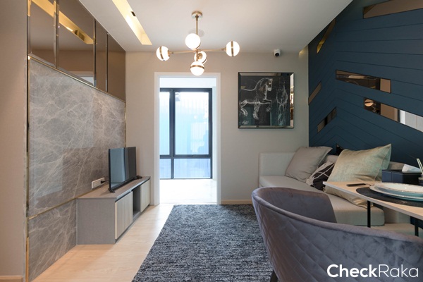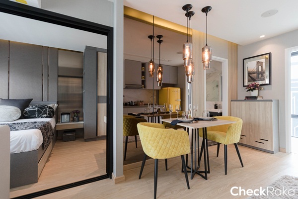 ห้อง Type นี้ได้จัดพื้นที่ครัวไว้ด้านหน้าเชื่อมต่อกับห้องนั่งเล่น ส่วนฝั่งขวาของห้องจะเป็นห้องนอนและห้องน้ำ