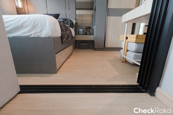 ห้องนอนกั้นด้วยประตูบานเลื่อนกรอบอลูมิเนียมสีดำ สามารถนอนดูทีวีจากห้องนอนได้เลย