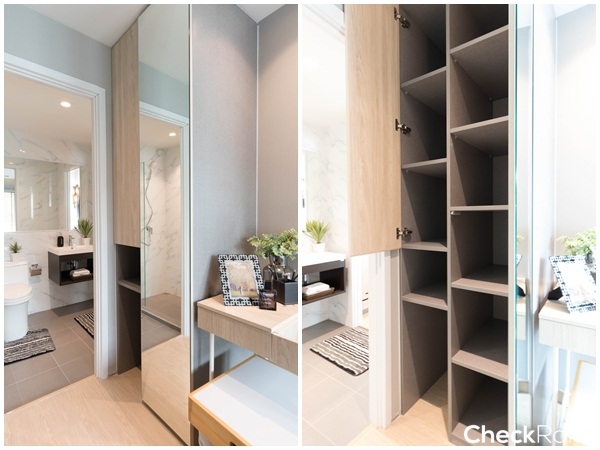 แบ่งการพื้นที่ใช้งานโซนแห้ง โซนเปียกมาให้เรียบร้อย ได้กระจกเงาบานใหญ่กรอบสีขาว