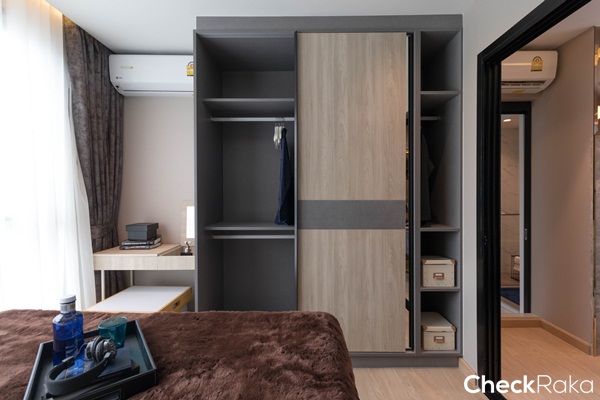และตู้เสื้อผ้าบานเลื่อน Built-in สูงจรดฝ้า ฝั่งขวาสุดเป็นชั้นวางของแบบเปิดโล่ง